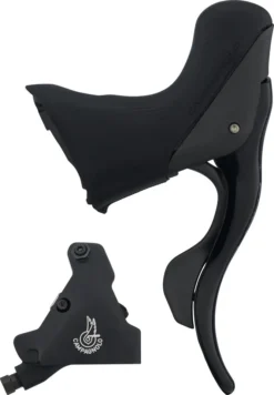 Le frein à disque hydraulique de Campagnolo Chorus est équipé de leviers de frein et de vitesses Ergopower à 12 vitesses pour la roue arrière et de leviers à 2 vitesses pour la roue avant.