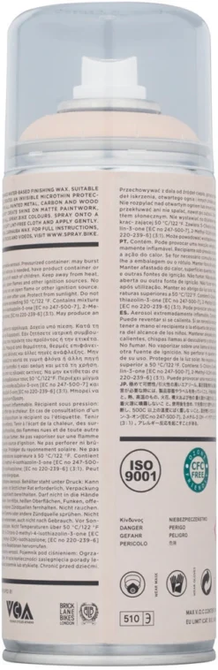 Spécifications :Désignation:Spray Bike Acrylic Paint in AerosolApplication:cadre, fourche et autres composants à vernirCaractéristiques :contient de la cire de carnaubaidéal pour l’acier, l’aluminium, le carbone et même le boiscouche protectrice invisiblepas d’effet brillantutilisation multiple possible, en particulier après le nettoyage du véloUtilisation :n’utiliser Spray.Bike que sur des surfaces sèches et propresvaporiser sur un chiffon non pelucheuxs’assurer qu’il y ait assez de cire sur le tissuappliquer délicatement sur le cadrecontinuer jusqu’à formation d »une couche uniforme